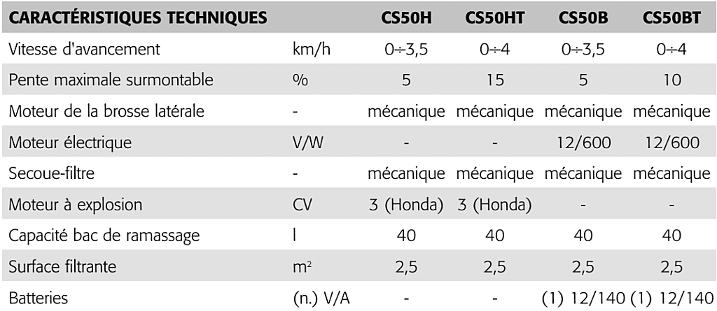 - Grâce à sa robustesse, la CS50 offre la possibilité de travailler en toute tranquillité sur des surfaces irrégulières. Elle permet d'obtenir une économie en termes de consommation et une plus grande sécurité grâce à la rotation de la brosse qui ne s'active que lorsque la machine est en marche. Elle offre une excellente fiabilité du groupe de transmission grâce à l'emploi de courroies trapézoïdales.